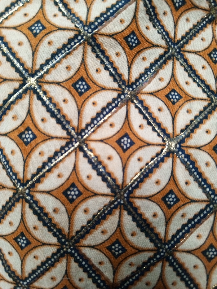A close-up image features a repeating pattern on fabric. The design incorporates quarter circles in warm orange and white, arranged in a grid-like layout. Small, dark blue squares decorate the centers of each circular motif. Intersecting diagonal lines, comprised of dark blue and white dots, form a lattice. Silver threading runs parallel to the dotted lines, adding a subtle shimmer to the fabric's texture.