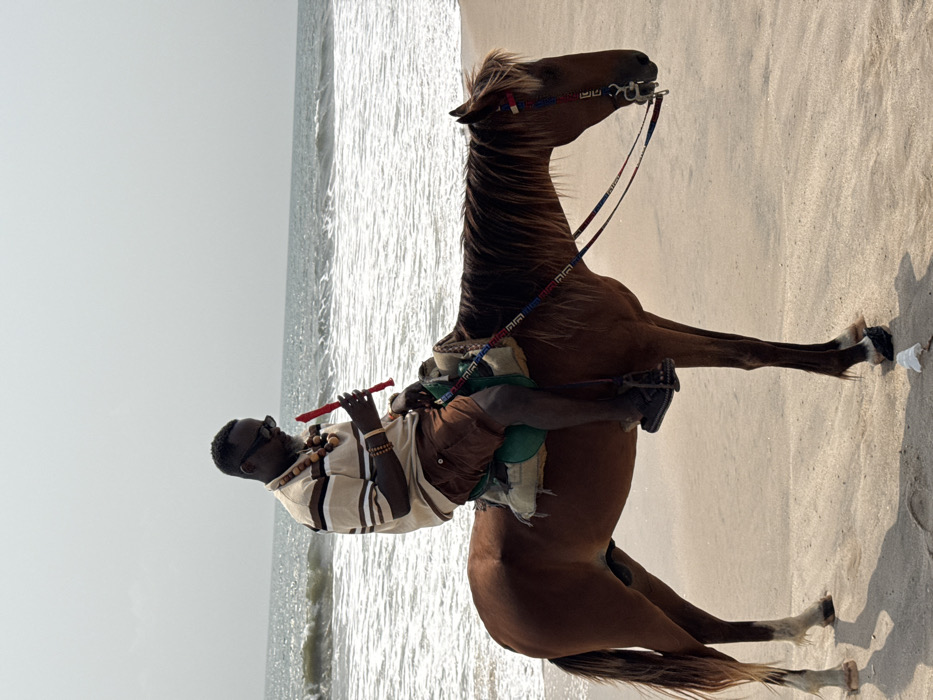 A male individual is depicted seated astride a brown horse on a sandy beach in Mopo Onijebu, Nigeria