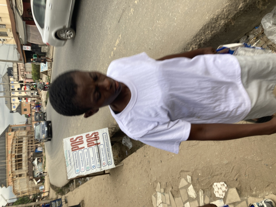 A street scene shows a person wearing a white t-shirt standing near a POS advertisement sign. The sign lists services like withdrawing money, depositing money, transferring money, paying bills, and buying JAMB pins. A white car is visible in the background on a road with other vehicles. Buildings are on the left side of the street, some under construction. The ground near the person is partially covered with broken tiles.