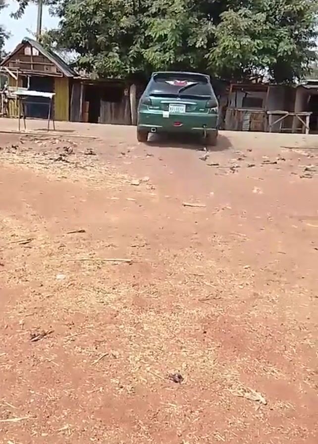 green car backing up and driving away on a dirt road. There are several small, wooden buildings and a large tree in the background. The ground is dry and covered in loose debris. The sky is visible above the tree.