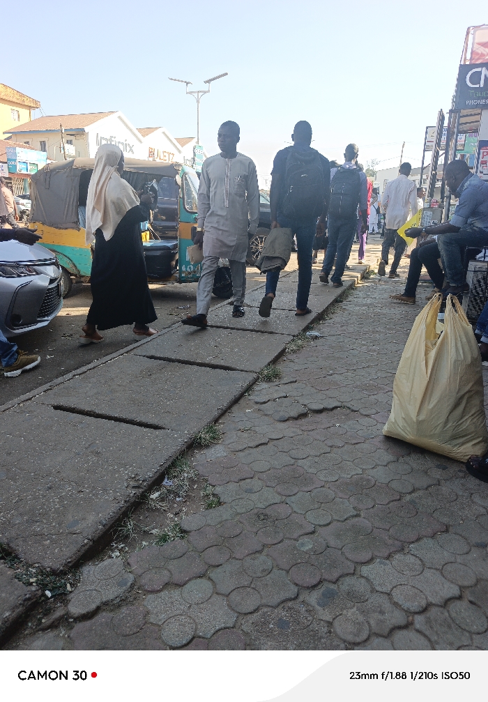 This image depicts a bustling commercial street in Jos, Nigeria, during daylight hours under a clear sky. The scene is viewed from a low angle, focusing on a pedestrian walkway and the adjacent street. The foreground features a worn pedestrian path composed of two distinct sections: concrete slabs covering a drainage channel on the left and patterned, circular interlocking pavers on the right, both showing signs of wear and sparse vegetation in cracks. Approximately 8-10 individuals are visible. In the mid-ground, walking towards the right: a woman in a black abaya and a light cream headscarf (hijab) is seen near a parked or slowly moving yellow and green Keke Napep (tricycle taxi). Immediately to her right, a man wearing a light grey traditional tunic and trousers walks forward, followed closely by another man in dark clothing, carrying a black backpack and a light-colored bag in his left hand. Further to the right, a man is seated on a low structure, holding a yellow item, with a large, light-yellow fabric bag resting on the ground beside him. Other pedestrians are visible walking in the background. To the far left, the front bumper and headlight of a silver car are partially visible. Shop facades line the street, displaying commercial signage including "Infinix" and "JULETZ" above the Keke Napep, and a sign partially reading "CN PHONES" further down the street on the right. A street light pole with two solar panels is positioned centrally in the background. The overall environment suggests a lively urban market or shopping district.
