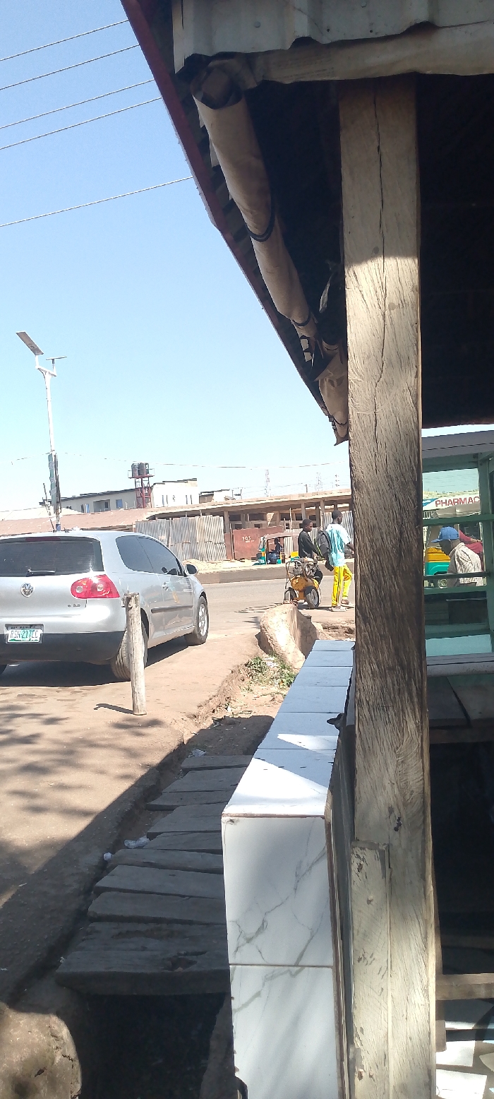 The image captures a sunlit street scene in Jos, Plateau State, Nigeria, evidenced by the "PLATEAU JOS NGN 217GC" license plate on a silver Volkswagen Golf parked or stopped on the left side of the road. The perspective is from beneath an awning or overhang, with a prominent, weathered wooden support beam and a white-tiled counter in the immediate foreground on the right. A clear blue sky dominates the upper portion, indicating bright daylight and casting sharp shadows. The road appears paved, with an open dirt drainage ditch running parallel to it on the right, partially spanned by crude wooden planks. Further down the road, on the left, a tall pole equipped with solar panels and a light fixture stands. Across the road, behind the silver car, a light-colored building is visible. To the right of that, a structure under construction or renovation features corrugated metal siding, with the word "JOS" discernible on a brown section. In the far background, a red metal tower supports a water tank, accompanied by additional buildings and overhead utility wires. Several individuals are present. Through a green-framed glass enclosure on the right, a person wearing a blue cap and a patterned shirt is partially visible. On the roadside, a person in dark attire pushes a yellow wheeled apparatus (possibly a generator or pressure washer). Another individual, wearing a light blue shirt and bright yellow trousers, walks away from the camera. Further down the road, near a yellow and black tricycle (keke napep), at least one additional person is observed.