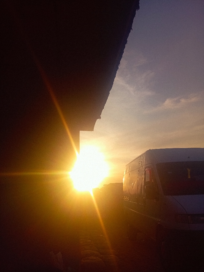 The image depicts an outdoor scene at either sunrise or sunset in Bukuru, Nigeria, characterized by strong backlighting. A brilliant, low-hanging sun, exhibiting significant lens flare and starburst effects, dominates the central-left portion of the frame. A dark, irregular silhouette, consistent with the underside of a roof or architectural overhang, occupies the upper-left quadrant, partially obscuring the sun and creating a sharp contrast. To the right, a light-colored van or minibus is visible, parked and angled slightly towards the left, with its front and side partially illuminated by the sun's glare but largely in shadow. The sky transitions from bright orange and yellow near the horizon, behind the sun, to a muted purplish-blue at the upper-right, with indistinct cloud formations present. The ground in the foreground is dark and appears uneven, with minimal discernible features. No individuals or specific actions are visible.