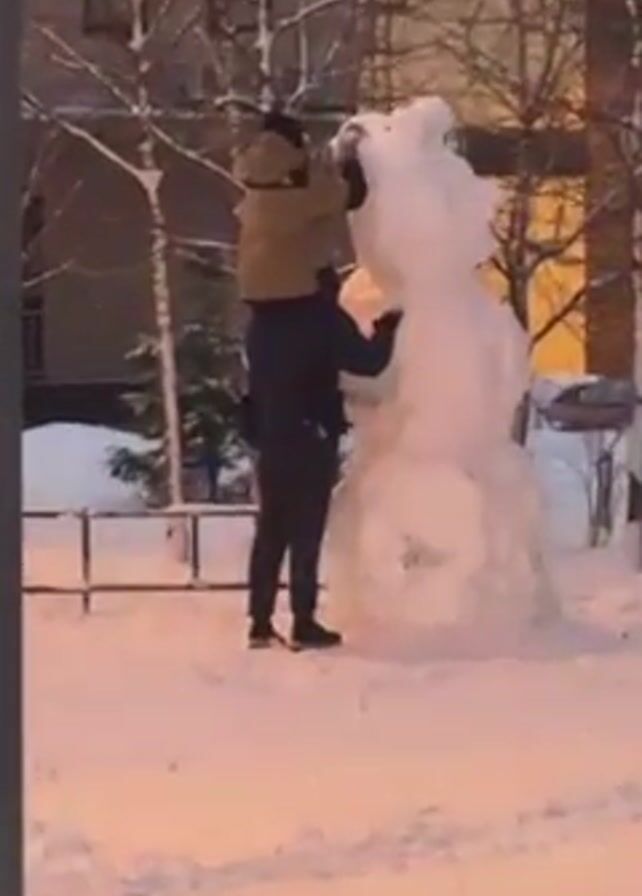 Two people are building a snowman. One person, wearing a tan jacket, is sitting on the shoulders of the other, who is wearing a dark jacket. The person on the shoulders is putting snow on the top of the snowman. The snowman is very tall and made of multiple large snowballs. The environment is snowy, with buildings, trees, and a fence in the background. It appears to be dusk.