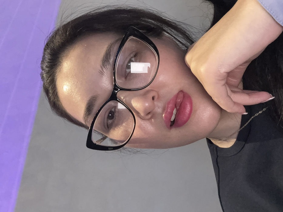 A female individual is depicted in a close-up, head-and-shoulders shot, located in an indoor setting within Tashkent, Uzbekistan. She wears dark cat-eye spectacles, a dark crew-neck top, and a thin silver chain necklace. Her lips are coated in pink lipstick, and her tongue is slightly extended. Her right hand, exhibiting white-tipped fingernails, is positioned adjacent to her chin. The subject gazes directly into the camera. The background features a plain light grey wall, with a distinct diagonal purple light source or reflection visible in the upper left portion of the frame.