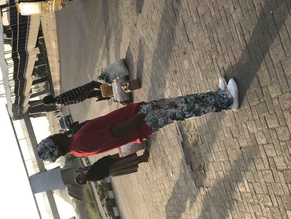 A man wearing a red shirt, floral pants, and white shoes stands on a brick pavement. A white bag and containers are next to him. A pedestrian bridge looms in the background. Other people are present, including one in a striped shirt.