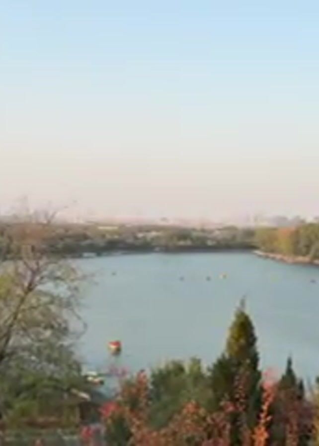 The video presents a scenic view of a lake surrounded by lush greenery. The water is calm, reflecting the sky, with small boats scattered across its surface. In the background, a cityscape is visible under a clear sky. Trees are scattered in the foreground, some displaying autumn foliage, suggesting the time of year.