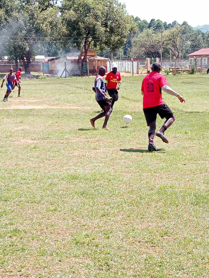 The image depicts an outdoor soccer match taking place on a grassy field in Chevaywa ward, Kenya, under clear daylight conditions