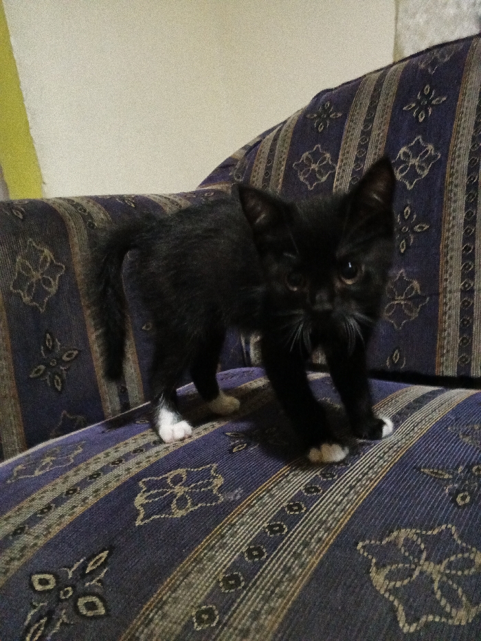 - "A small, mostly black kitten with white paws stands on a blue and tan patterned couch" by FM-n8S452, licensed under CC BY 4.0