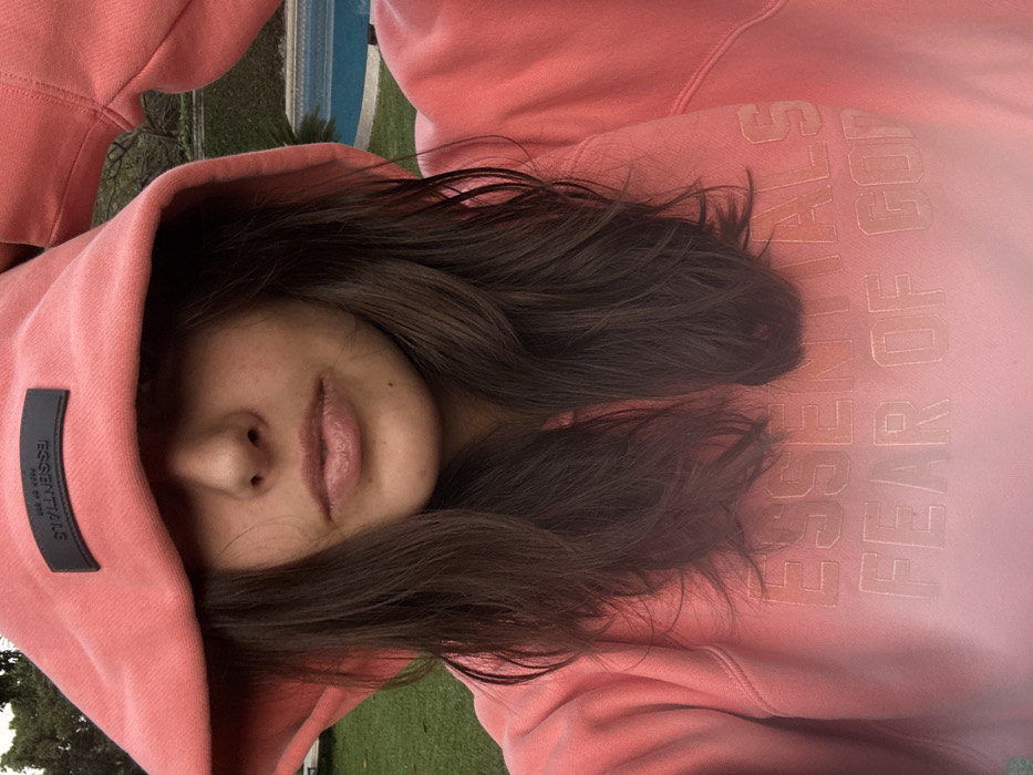 A person with brown, wavy hair and fair skin wears a salmon-colored hoodie with the hood up. The hoodie has the word "ESSENTIALS" and "FEAR OF GOD" embossed on the chest. A black tag with "ESSENTIALS" is visible on the left side of the hood. The background includes green grass and glimpses of a blue structure. The image is rotated counterclockwise.