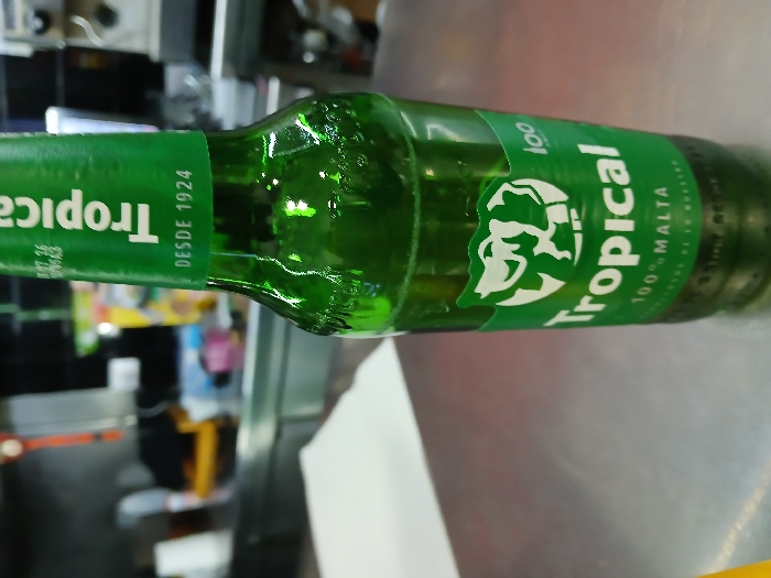 - "A green glass bottle of Tropical 100% Malta beer sits horizontally on a gray surface" by FM-XbczA3, licensed under CC BY 4.0