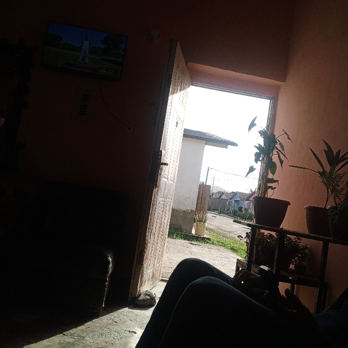 This image presents an interior perspective looking out onto a residential street in Altagracia, Venezuela, under bright daylight conditions. The interior foreground is characterized by strong backlighting, silhouetting objects. On the left wall, a wall-mounted flat-screen television displays a figure in a white uniform on what appears to be a green sports field. Below the television, electrical outlets and visible wiring are present. A dark, upholstered piece of furniture, possibly a sofa, is partially visible in the lower-left quadrant. In the immediate foreground, the lower body of an individual, dressed in dark attire, is visible with legs extended. Their hands are holding a mobile phone. A light-colored wooden door stands open, its edge sharply lit by the exterior sun. A small, gray rock is situated on the floor at the threshold of the doorway. The exterior view reveals a residential street. A metal shelf on the right, positioned near the doorway, holds multiple potted plants, including one with prominent heart-shaped leaves. The street surface appears to be either paved or a packed dirt road with grassy shoulders. Across the street, a building with a white upper facade and a dark roofline is visible. Further along the street, several single-story residential buildings, some painted in light blue and others white, line the thoroughfare. Utility poles with overhead lines are discernible. In the distant background, hills or mountains rise against a bright sky, indicating a clear day.