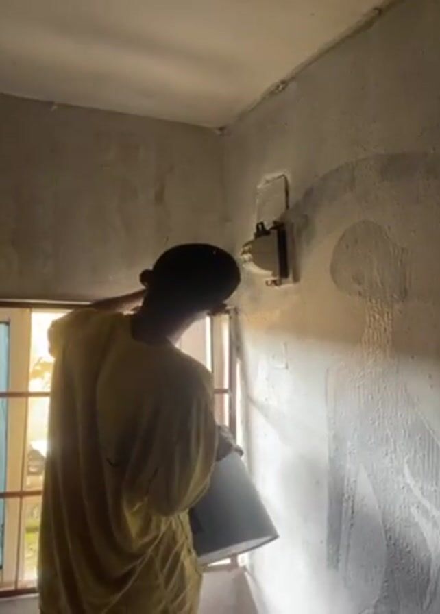 A young man in a yellow shirt is painting a room. He is standing near a window and painting the wall around an electrical box with a brush. He is holding a paint bucket in his other hand. The room appears to be under renovation.