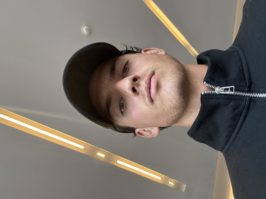 A low-angle selfie captures a person wearing a dark baseball cap and a black zip-up jacket. The individual has short, dark hair, fair skin, and light-colored eyes. The background features a plain ceiling with a linear light fixture, casting an artificial glow. The zipper of the jacket is visible, adding a detail to the clothing. The overall composition creates a sense of height and perspective.