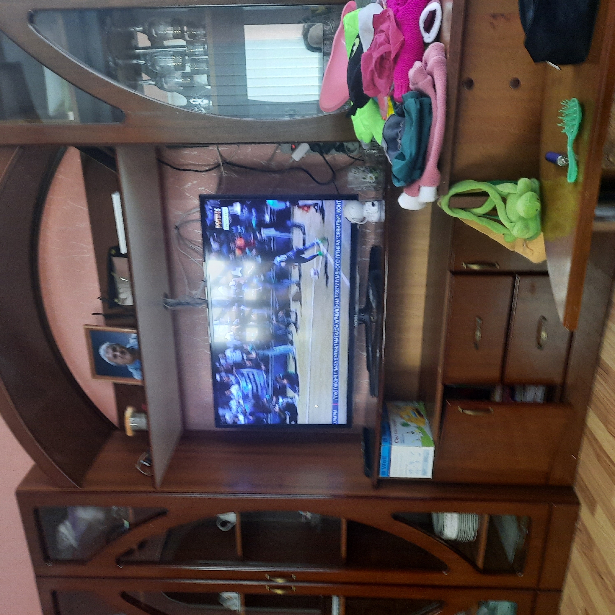 The image depicts an interior room within a residence in Kurganinsk, Russia. A large, dark brown wooden entertainment unit, composed of multiple sections including cabinets, shelves, and drawers, occupies the majority of the background. Central to the unit is a flat-screen television displaying a soccer match in progress, featuring multiple athletes on a green field. Russian text visible at the bottom of the screen identifies the channel as "МАТЧ!" (MATCH!) and states, "ЛУИС ГАРСИА СМЕНИЛ МАТИАСА АЛМЕЙДУ НА ПОСТУ ГЛАВНОГО ТРЕНЕРА 'СЕВИЛЬИ'" (Luis Garcia replaced Matias Almeida as head coach of 'Sevilla'). A white figurine is positioned on the shelf to the right of the television. To the left of the television, a light blue and white box labeled "D Well" rests on a lower shelf. Below it, a dark wooden cabinet door is slightly ajar, revealing internal contents. The upper left section of the entertainment unit comprises two glass-fronted cabinets containing white ceramic dishes and mugs. The upper right section features a similar glass-fronted cabinet displaying multiple inverted wine glasses. On an open shelf above the television, a framed photograph of an older male with grey hair is visible. Adjacent to it, a small clear jar with a yellow lid, eyeglasses, and a white notebook are present. To the right of the television, on a surface of the entertainment unit, a disorganized pile of multicolored clothing, predominantly in shades of pink, green, black, and white, is stacked. In the lower right foreground, a portion of a dark wooden table with a metal base is visible. On its surface, a bright green plastic hairbrush and a small, cylindrical blue and silver object (possibly a lighter) are placed. A green plush toy, appearing to be a frog or turtle, with a strap, rests on the table, leaning against the entertainment unit. The room's walls are a light salmon/pink color, possibly with a subtle texture. The floor is covered with light brown wooden laminate planks. No live individuals are present in the immediate scene, aside from those depicted on the television screen.