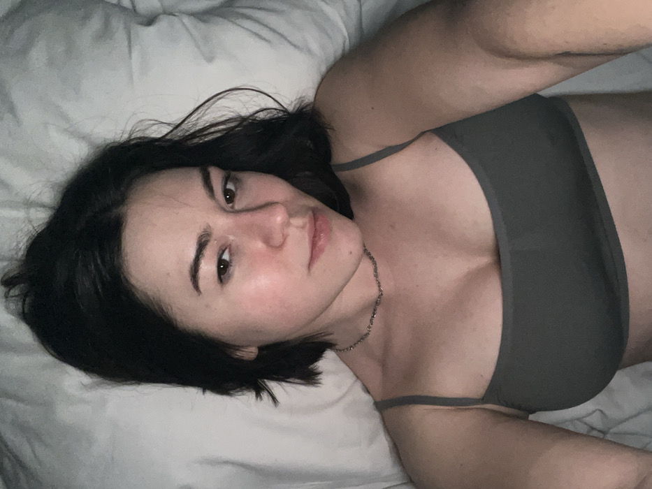 A fair-skinned woman with dark hair and eyebrows lies on her back against a white pillow or bed. She wears a gray sports bra. Her face is turned slightly to the right, and she gazes directly at the camera. A delicate silver necklace adorns her neck. The lighting appears soft and muted, creating a casual and intimate atmosphere.