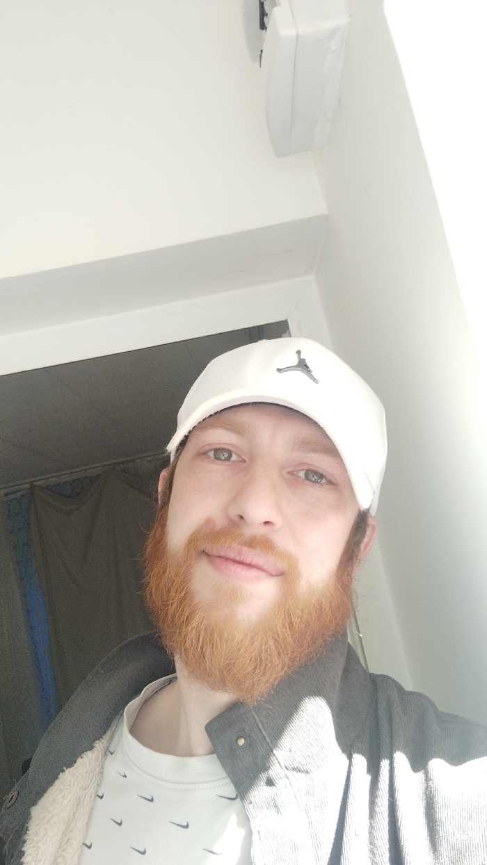 A male subject, appearing as a young adult, is depicted in a selfie-style portrait within an indoor environment. He has reddish-blonde facial hair, hazel eyes, and a small red blemish visible beneath his left eye. The subject is wearing a white baseball cap with a silver Jordan Jumpman logo, a white t-shirt adorned with multiple black Nike swoosh logos, and a dark grey corduroy jacket with a visible cream-colored fleece lining. Strong natural light illuminates the scene, casting highlights on the subject's right side. The background features white walls and ceiling. A white rectangular object, possibly a security sensor, is mounted on the upper right wall. To the subject's left, a dark, indistinct area, possibly a doorway with a dark curtain or fabric, is visible. The location is Unknown, Unknown.