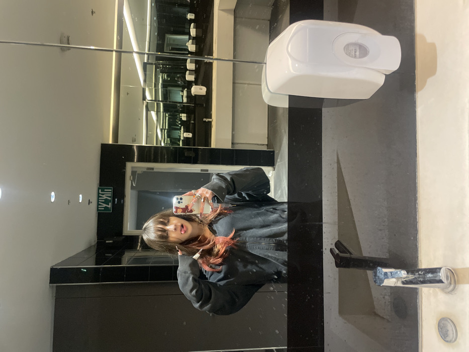 A person takes a selfie in a restroom mirror. The individual has shoulder-length dark hair with red highlights and wears a dark jacket. The restroom has a white sink with a silver faucet and a white soap dispenser on the wall. The walls are mostly tiled in black, with some white sections. An exit sign with Hebrew lettering is visible above a doorway in the mirror's reflection. Other soap dispensers are visible further in the mirror.