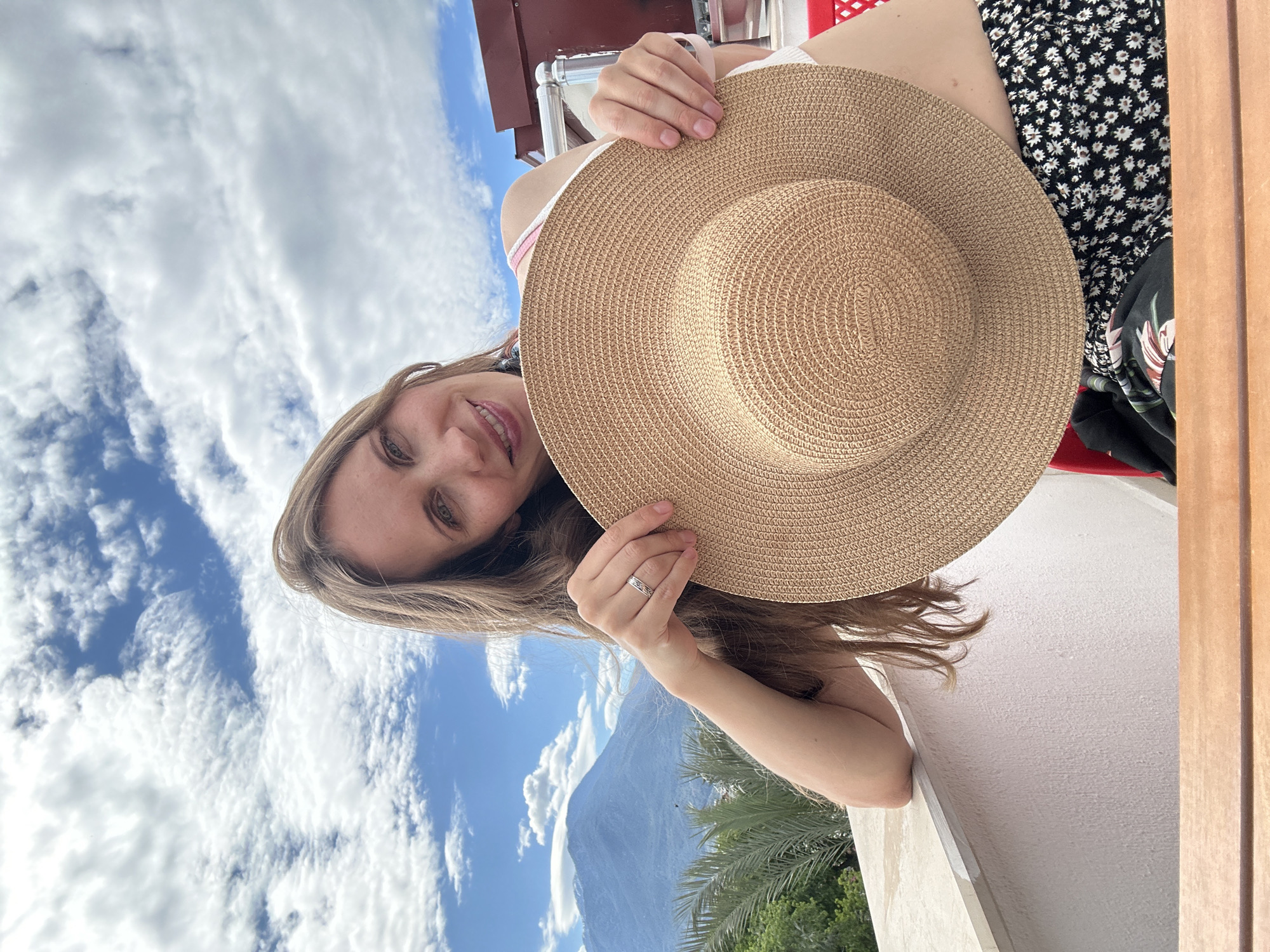 A woman with long brown hair and fair skin holds a large straw hat. She stands on a balcony. Behind her is a blue sky with white clouds, a mountain, and green trees. The woman wears a silver ring on her left hand. A building with a red roof can be seen in the upper left. The environment suggests a warm, sunny day in a location with mountainous terrain. The scene is likely set in Fethiye, Turkey, as indicated by the city name.