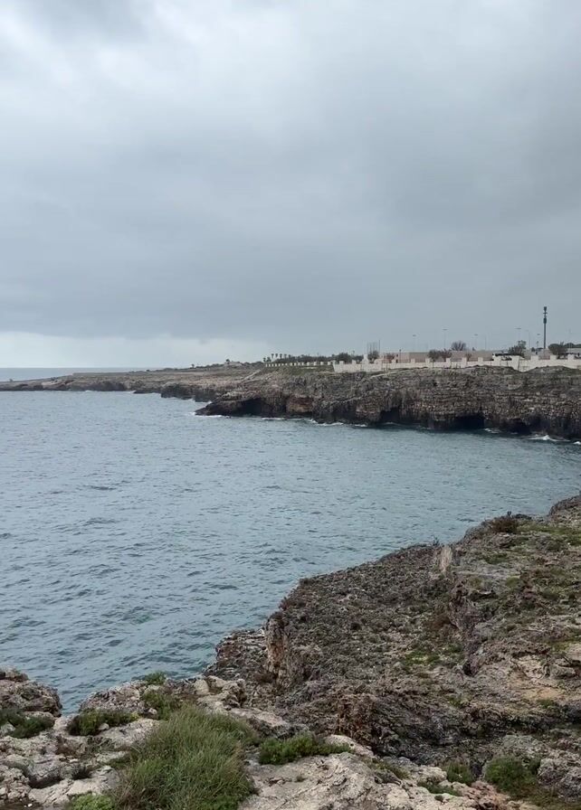 The video showcases a rocky coastline under a heavily clouded sky. The sea, a somber blue, stretches out to the horizon, marked by a small, rocky island and a faint indication of further land. The foreground features rugged, rocky terrain sparsely covered with low-lying vegetation. In the distance, a stretch of land is visible, marked by some structures and a wall, seemingly indicating a settlement or developed area along the coast. The weather appears overcast, setting a subdued tone for the scene. The camera pans slightly to the left, emphasizing the expanse of the sea and the desolate, rocky landscape.