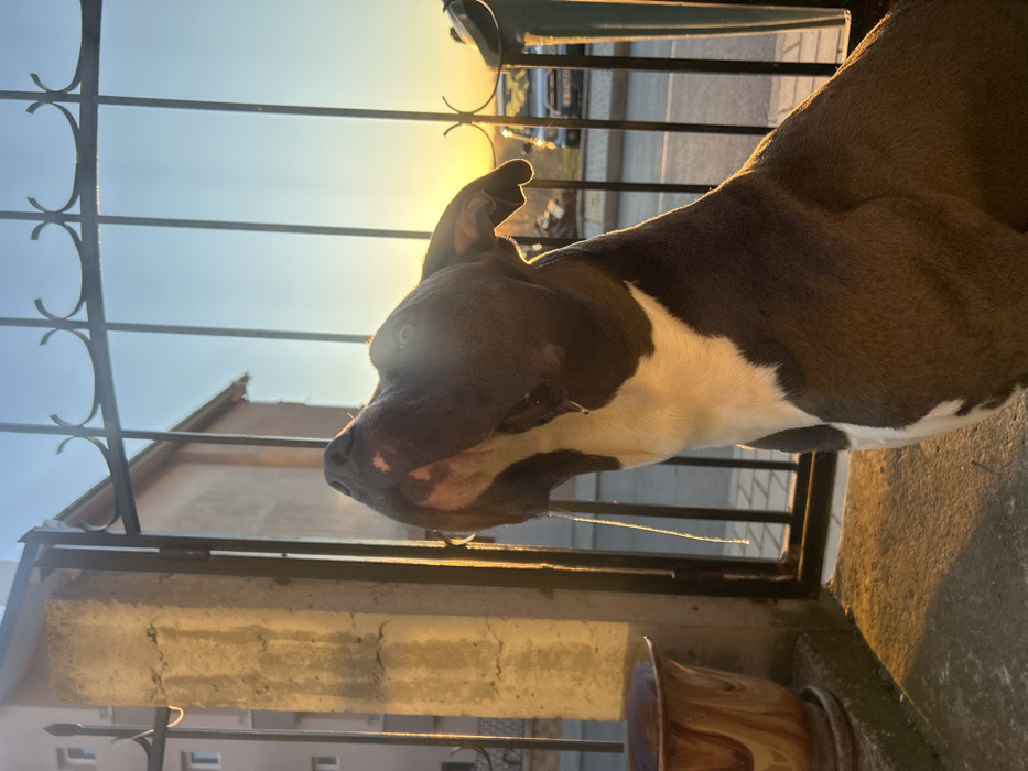 The image displays a blue-nosed American Pit Bull Terrier, or similar bully breed, with a dark grey coat and prominent white chest and muzzle markings, situated outdoors in Aheloy, Bulgaria. The dog is positioned in the foreground, facing slightly right, with its head tilted sharply upward, revealing a strand of saliva dripping from its mouth. Strong, warm, directional light, indicative of either sunrise or sunset, illuminates the dog from its right side, casting highlights on its fur and the surrounding elements. To the dog's left, a light brown, patterned ceramic pot rests on a concrete surface. Behind the dog, a dark metal gate or fence with vertical bars and decorative upper scrollwork is visible. A concrete pillar forms part of this gate structure to the left. Beyond the gate, a multi-story, light-colored building with multiple windows is partially visible on the left side of the frame. The background features a clear sky, transitioning from bright blue at the top to an orange-yellow hue near the horizon. In the mid-ground, beyond the fence, a light-colored vehicle, possibly an SUV, is discernible on what appears to be a paved road or driveway. No human figures are present.