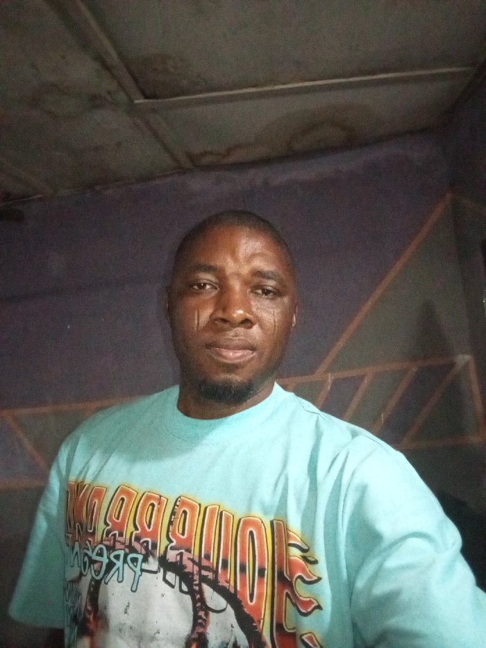 A man with a shaved head and short beard wears a light blue t-shirt with a large, colorful graphic. He stands against a textured wall. The lighting is dim. Two markings are visible on the left side of his face, near his eye and cheek. The ceiling above appears to be metallic or industrial.
