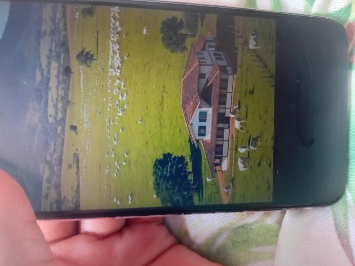 A mobile phone displays a landscape image. The scene includes a large green field dotted with numerous white cows, grazing peacefully. A traditional-style house with a red tile roof and white walls stands prominently in the field. A few scattered trees provide shade. Mountains appear in the distance. The phone screen has a visible crack. The phone is held in someone's hand, with a floral patterned surface visible beneath.