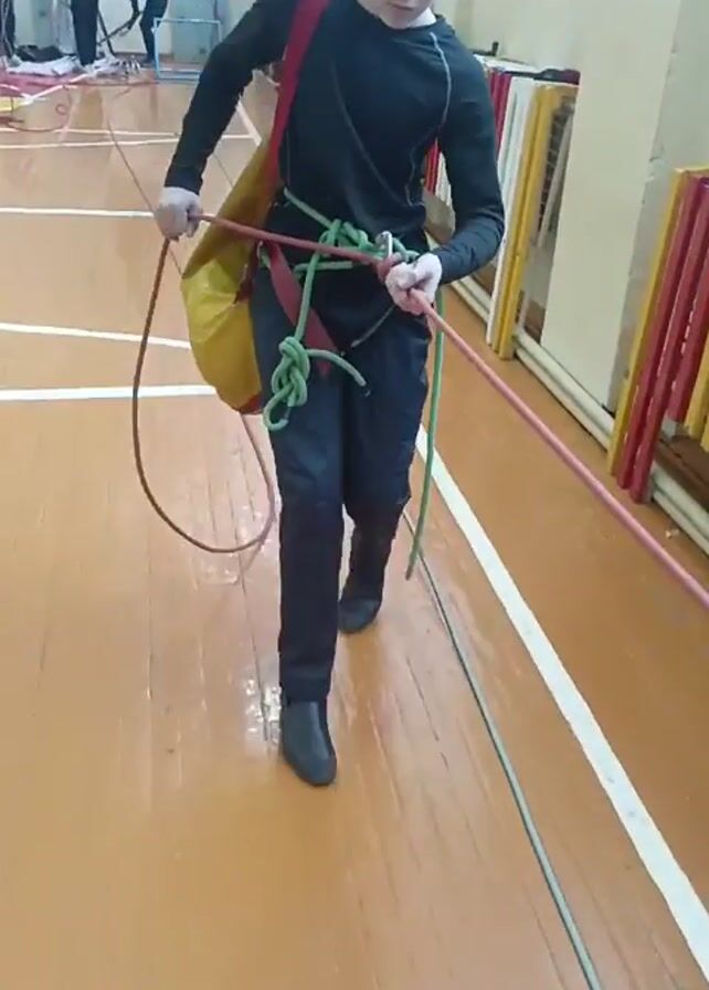 A young person wearing a black long-sleeved shirt, black pants, and black shoes is walking on a varnished wooden floor in a gymnasium. The floor has white lines painted on it. They are wearing a red harness with green ropes and carrying a yellow bag with a red strap over their shoulder. They are holding two ropes, one brown and one green, and appear to be inspecting the knot tied to the harness. Other people can be seen in the background, some of whom are near a climbing wall. There are benches and other gym equipment visible. The lighting is bright.