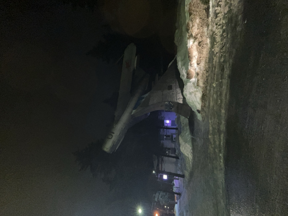 The image depicts a static display of a Soviet-era MiG-15 (or similar) fighter jet monument at night, located in Klin, Russia