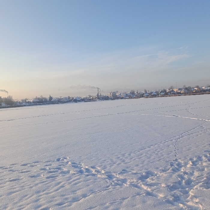 A snow-covered landscape under a pale blue sky. A town or village is visible in the distance, partially obscured by mist or haze. A prominent chimney or industrial structure emits smoke. Footprints and tracks mark the expanse of the snow-covered ground, suggesting activity or movement across the frozen surface. The sun's rays create shadows and highlights, adding depth and texture to the snow.