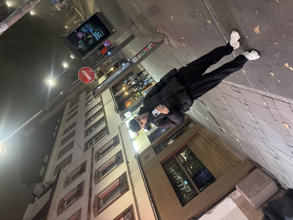 A young male stands on a paved sidewalk at night, leaning slightly to the right in the frame, holding a white smartphone in his hands and looking down at its screen. He wears a black puffer jacket, black sweatpants, and white and grey patterned athletic shoes. To his left is the illuminated storefront of a business named "L'abbiocco," located on the ground floor of a multi-story building with a light-colored facade, featuring multiple windows with open shutters and decorative iron railings. To the male's right, extending into the background, is a street featuring a red "No Entry" sign on a pole, an illuminated advertising kiosk with French text, and several streetlights. Blurred figures are visible further down the street, along with a partial "Burger King" sign. The sidewalk shows scattered autumn leaves. This scene is located on Rue du Vieux Marché aux Poissons in Strasbourg, France.