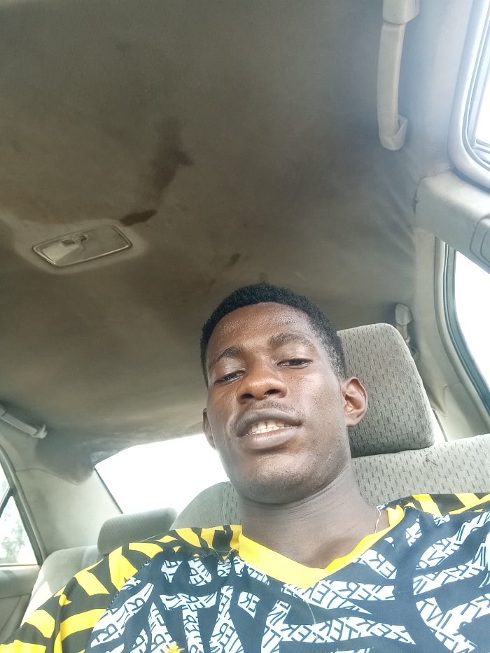 A selfie inside a car. A young Black man with short hair and a yellow and white patterned shirt smiles slightly. The car's interior is visible, including the seat headrest, window, and ceiling. Stains mark the car's ceiling above the person, and a light fixture is present near the roof. Outside the window, hints of greenery and daylight can be seen. The angle is from slightly below the person's face.