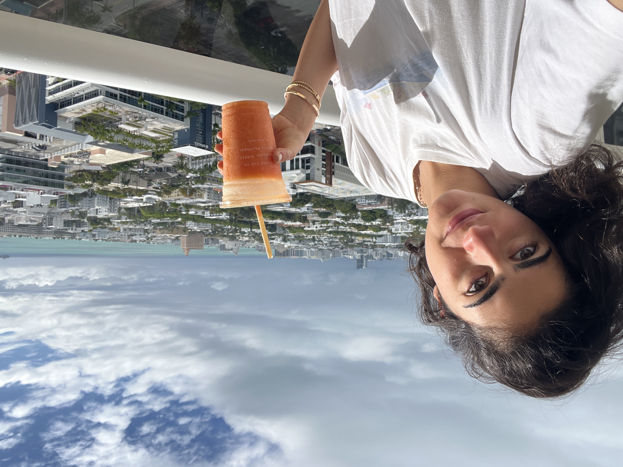 A young woman holds a drink with a straw in a plastic cup standing on a balcony overlooking the city of Miami Beach, United States of America. The woman is fair-skinned with dark curly hair. She wears a white T-shirt and gold bracelets. The drink in her hand is orange and has a straw sticking out. The cup has text on it. Behind the woman and drink is a view of a cityscape with buildings, trees, and the ocean. The sky is cloudy.