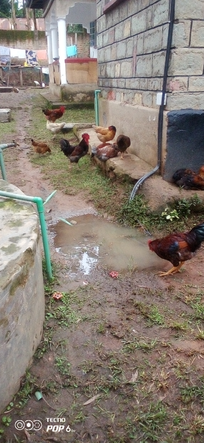This image depicts a residential outdoor area in Mahiakalo ward, Kenya. The scene features multiple chickens (Gallus gallus domesticus) in a muddy, partially grassed yard. **Subjects:** * Ten chickens are visible. One dark brown rooster with a red comb stands near a muddy puddle in the foreground. Another similar rooster is further back, to the left of the group near the building. * A light brown hen stands on a concrete ledge to the right, next to a darker brown hen. * Another light brown hen is partially obscured behind the rooster on the ledge. * A white hen is positioned on a raised concrete block in the mid-ground, with a reddish-brown hen standing behind it. * Two more brown hens are further to the left, near a concrete slab. * One dark brown hen with lighter brown markings is visible resting against the base of the wall on the far right. * One small, mostly brown chick is partially visible in the distance, near clotheslines. **Objects and Structures:** * A building constructed with multi-toned rectangular stone bricks (beige, brown, grey hues) with dark mortar lines forms the right side of the image. It has a concrete foundation painted a lighter beige. A black conduit pipe runs vertically down the wall, secured by a white fixture. * A raised concrete ledge runs along the base of the brick building. * Another building is visible in the background, featuring white concrete pillars supporting a veranda or porch roof. * Clotheslines are present in the background, to the left of the pillar-supported structure, with several items of laundry (blue, patterned, light-colored) hanging to dry. * A large, round, grey concrete structure, possibly a water tank or cistern, is prominent on the far left. * Light green PVC pipes are visible, some running along the concrete tank and others protruding from the ground, forming a partial frame. * A muddy puddle with reflections is centrally located on the ground. * Two small, red, wheel-shaped objects (possibly valve handles or debris) lie on the ground near the puddle. * Other scattered debris, possibly small stones or plant matter, is present on the ground. * The ground is predominantly mud with patches of green grass and sparse vegetation. **Actions and Interactions:** * The chickens are generally standing or resting. The rooster in the foreground appears to be observing the puddle. None are actively feeding or fighting. * No human presence is observed. **Environment:** * The area is unpaved, characterized by damp, dark brown soil and patches of green vegetation. * The sky is not visible. Lighting suggests an overcast or late afternoon condition.