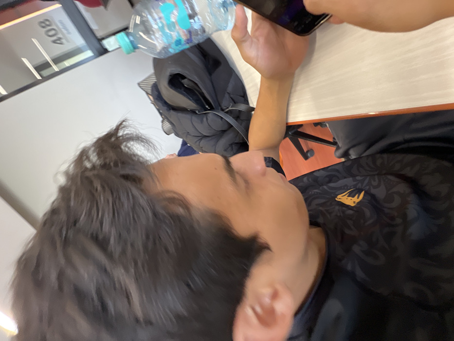 The scene is an interior view, located in Fraccionamiento Los Heroes Queretaro, Mexico. A male individual, primarily visible from the mid-torso upwards, is seated at a light-colored table. He has dark, wavy hair and a light-brown skin tone. The subject is wearing a dark shirt with a subtle, dark-on-dark pattern and a yellow emblem on the left chest. Both hands hold a black mobile phone, whose screen is illuminated with purple and blue hues, indicating active use. Positioned on the table to the right of the male is a clear plastic water bottle with a light blue cap, containing water and featuring blue labels. A dark jacket or similar garment is partially visible behind the bottle. Underneath the table, a portion of a black chair with a wheel is discernible. The background consists of a white wall, upon which a dark-framed sign displays the text '408' and 'salon'.