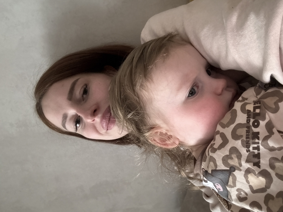 The image depicts an indoor scene in the city of Bol'shie Mkhi, Russia, featuring two individuals: an adult female and a young child. The adult female is partially visible in the upper portion, from the nose upwards, with reddish-brown hair, light-colored eyes, and full lips, looking slightly downwards and to the viewer's right. The young child occupies the lower frame, resting with its head tilted to the left, and eyes directed downwards. The child has fair skin, light-colored hair, and noticeably flushed cheeks. The child is wearing a light-colored garment with a brown leopard print pattern, featuring the inverted text "HELLO KITTY AND FRIENDS". A light-colored pillow or soft bedding is positioned to the child's right. The background is a plain, light grey wall with a subtle texture.