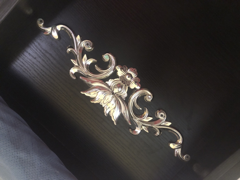 The scene is located in the city of Rido, Nigeria. The image displays a metallic, silver-colored ornamental appliqué affixed to a dark, horizontally grained wooden surface. The appliqué, oriented diagonally from the lower left to the upper right, features an intricate floral and scroll design approximately 35 cm in length. A large, multi-petaled flower forms the central motif, accompanied by a smaller flower below and to its right. Numerous curling leaf and vine-like elements extend from the central floral components. Several small circular depressions are visible along the perimeter of the metallic piece, serving as potential attachment points; one such depression near the upper right incorporates a small, light green, bead-like insert. The dark background exhibits a discernible wood grain pattern. A crumpled section of light grey, translucent mesh fabric is partially visible in the upper left quadrant of the frame. No individuals are present, and no actions or interactions are depicted.