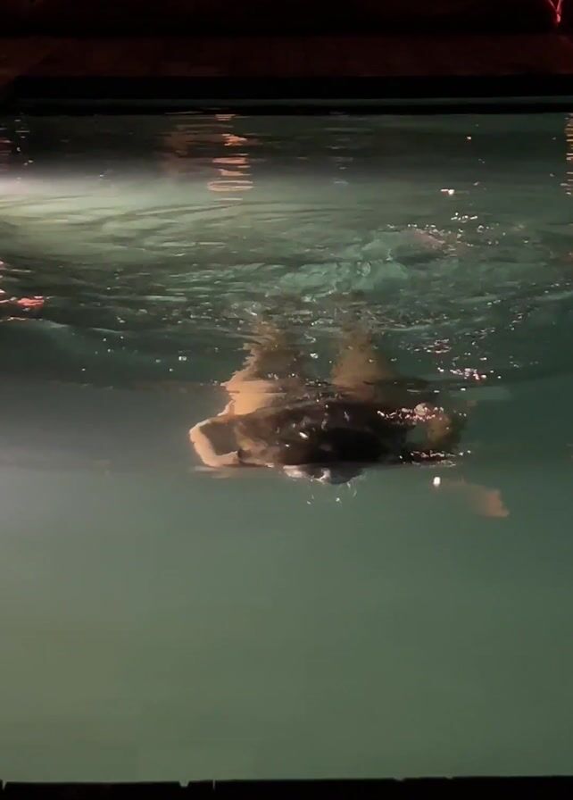 A woman emerges from underwater in a dimly lit swimming pool at night. Her hair is wet and hangs around her face as she surfaces, and the water reflects the surrounding lights. In the background, brown beanbag chairs are visible along the poolside. The video is shot from a low angle, capturing the pool’s surface and the underwater view as the woman swims up.