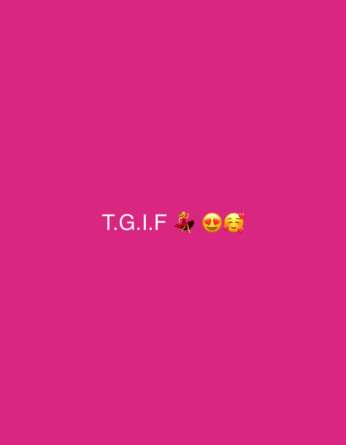 On a solid pink background, the acronym "T.G.I.F." is displayed in white letters. Next to it, there are emojis: a dancing woman, a smiling face with heart eyes, and another smiling face with hearts around it. The text and emojis are centered on the page. The color pink fills the entirety of the viewable space, providing a vibrant backdrop for the text and emoticons.