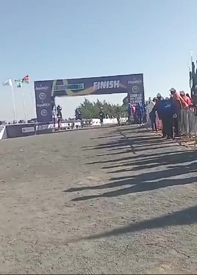 A runner approaches the finish line of a race. The runner is wearing dark athletic gear. He falls to the ground momentarily just before crossing the finish line. Behind him, spectators stand behind a metal barricade. A large sign with the word “FINISH” is overhead at the finish line. Flags of Kenya, Tanzania, and South Africa are on display. A small stage is to the left. A photographer sits on a box in the lower left. The ground is dirt.