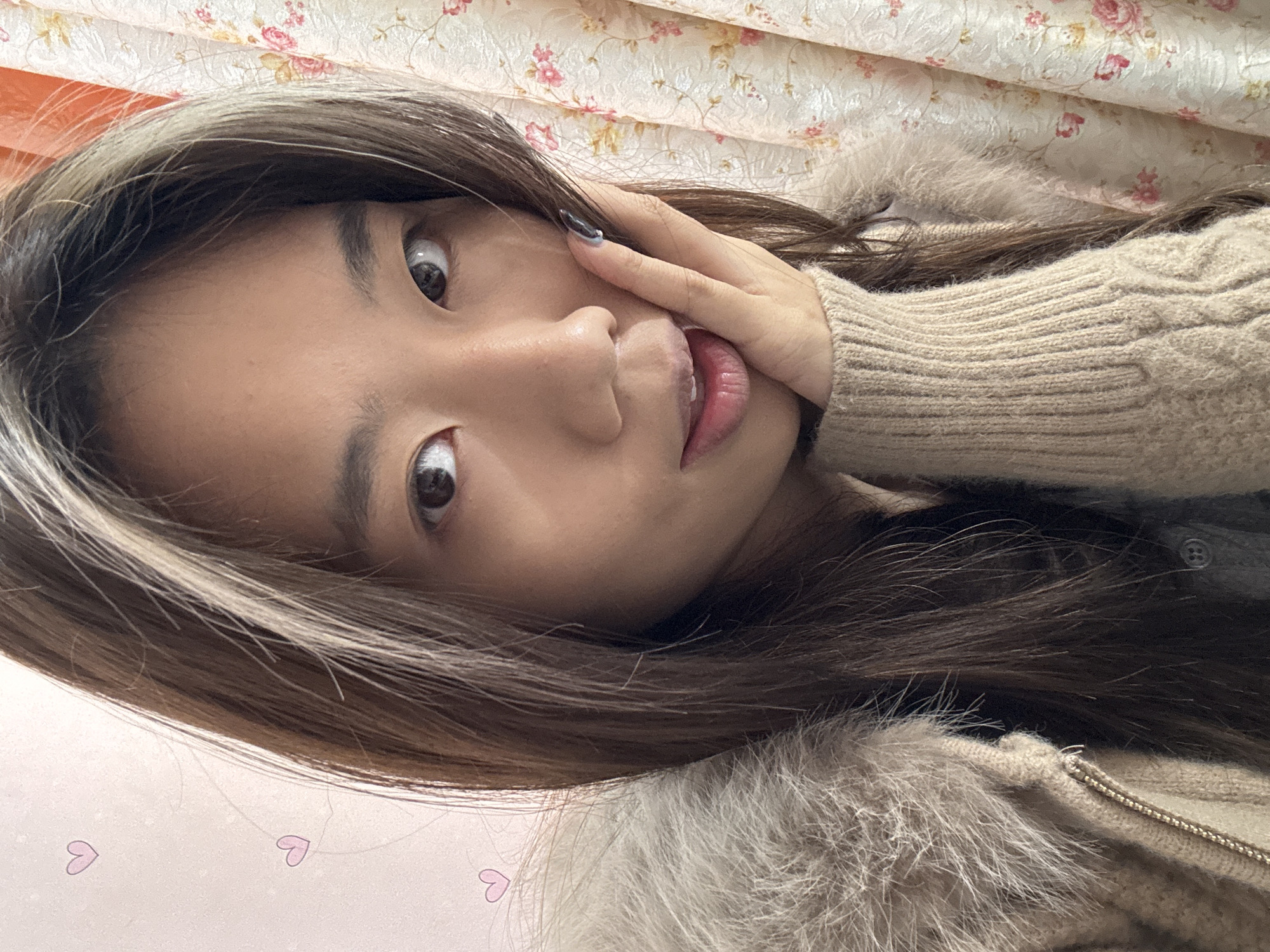 A young adult female is pictured in a selfie taken indoors. She is wearing a light beige sweater with a cable knit pattern on the sleeve and a fur-trimmed collar on a jacket. Her dark brown hair has blonde highlights. She has fair skin and appears to be touching her face with one hand, obscuring part of her mouth. The background includes a floral-patterned curtain or fabric. A small, heart-patterned wallpaper is visible in the lower part of the shot. The specific location within Shapingba District, China is not discernible from the image.