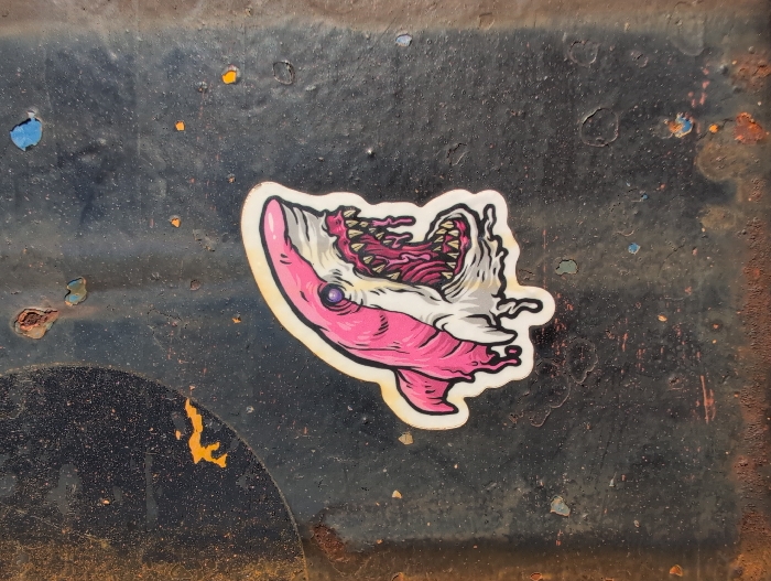 - "A self-adhesive sticker, approximately 10 cm in height, depicting a stylized shark is affixed to a dark, corroded metal surface in Perazića Do, Montenegro" by FM-5itlR2, licensed under CC BY 4.0