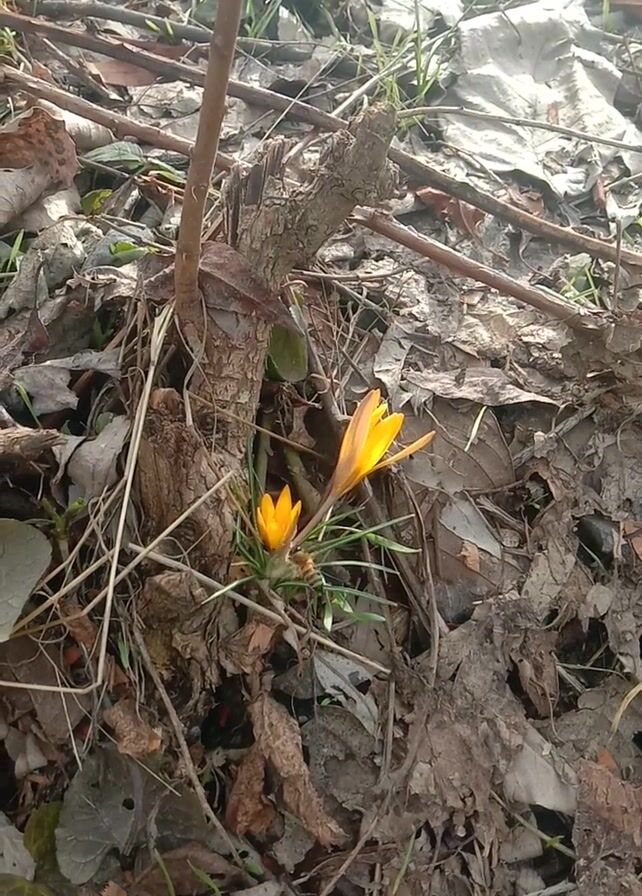 The camera is positioned looking down at a bed of dead leaves, small twigs, and a few blades of green grass. Scattered among the debris are two bright orange crocus flowers. A bee lands on the lower crocus flower. The scene is lit by sunlight.