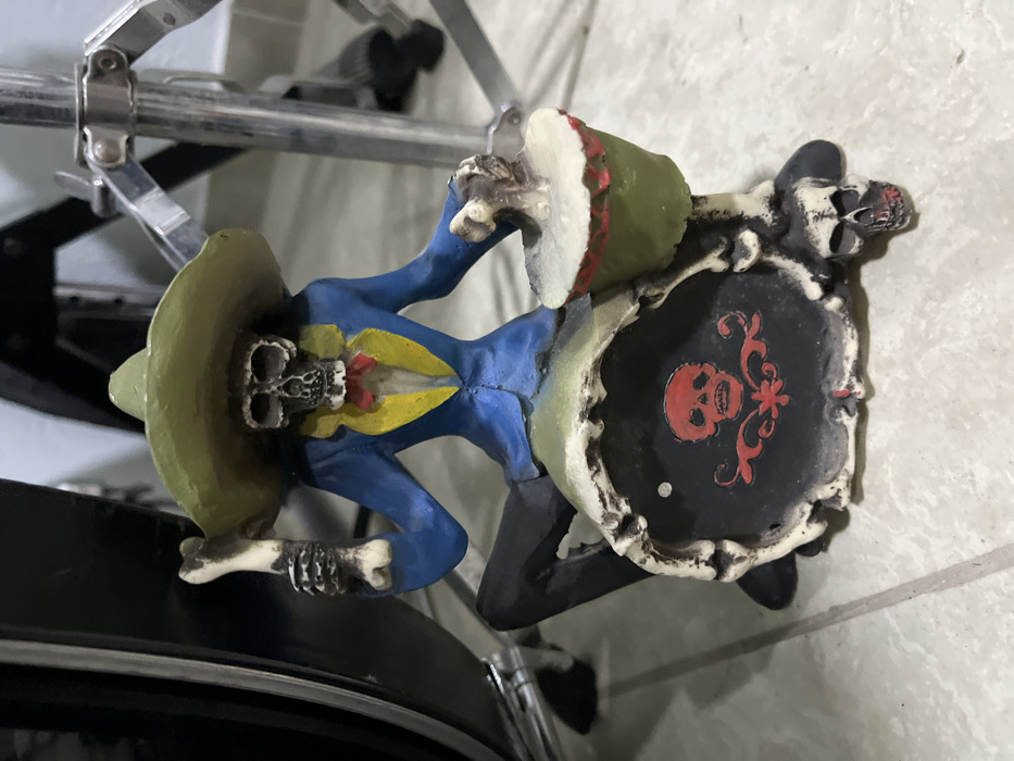 A skeleton figurine, dressed in blue with a yellow vest, wears a green sombrero. Its skull face is prominently visible. It holds a circular shield-like object with a black background and a red skull design. Another skeleton sits atop the shield. The figurine appears to be leaning against or attached to a metal frame, possibly part of a drum kit. The background is a tiled surface.