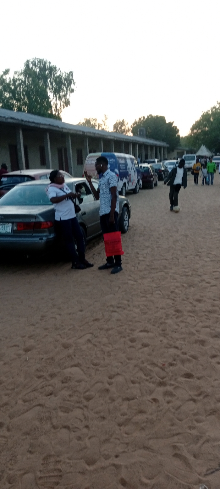 Two people stand by a car, seemingly in conversation. Several other cars and a van are parked nearby. A person kicks a soccer ball in the background, where a small group of people are walking away. The scene appears to be an outdoor event or gathering, with a building in the background, all set on a sandy or dirt-covered surface. The sky is bright, suggesting either early morning or late afternoon light.