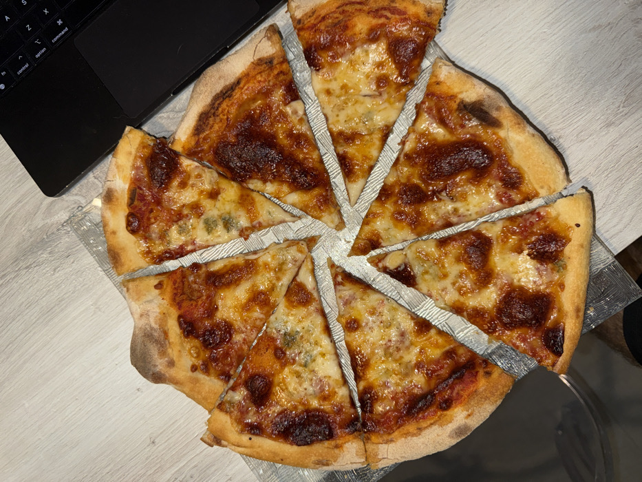 - "An overhead view depicts a pizza, approximately 30-35 cm in diameter, cut into eight triangular slices, arranged on a clear, textured glass serving tray" by FM-EvMDo2, licensed under CC BY 4.0