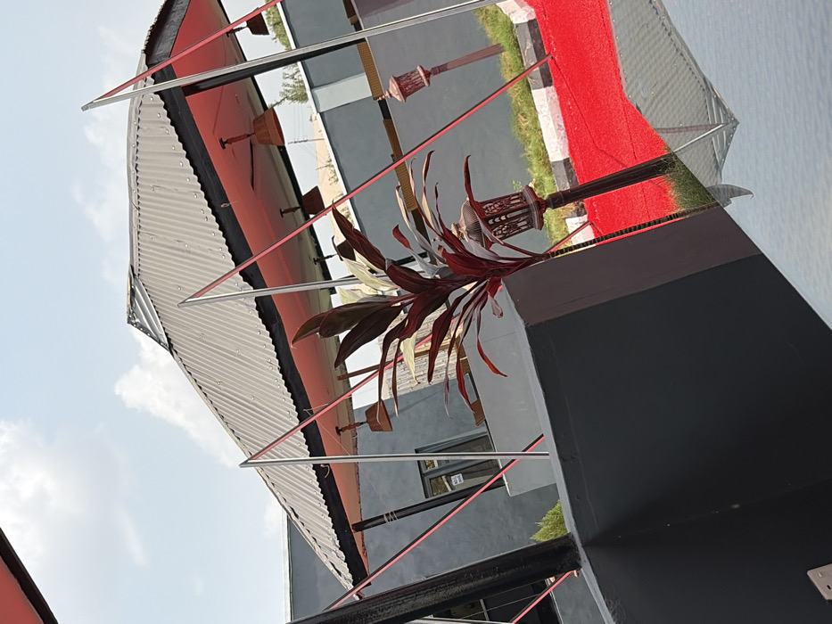 The image depicts an outdoor leisure or event space in Ogbomosho, Nigeria, illuminated by bright daylight under a partly cloudy sky. A prominent open-sided pavilion features a dark gray corrugated metal roof with a vibrant red underside, supported by multiple slender silver poles, some reinforced with red diagonal tension elements. Beneath the pavilion roof, several wicker-style ceiling fans are visible. The ground is primarily covered by a striking red surface, likely a carpet or paved area, bordered by a low white and black curb and patches of green grass. In the mid-ground, an ornate, dark-colored lamppost with a patterned glass lantern is present, partially obscured by a tall ornamental plant with dark red-green foliage. A similar lamppost is visible further in the background. To the left, a dark gray building with windows, one displaying a small "NO SMOKING" sign, forms part of the background structure. The immediate foreground includes a dark gray wall or barrier on the left and a reflective surface, possibly a glass table, on the bottom right, showing partial reflections of the scene. No individuals, specific actions, or interactions are depicted.