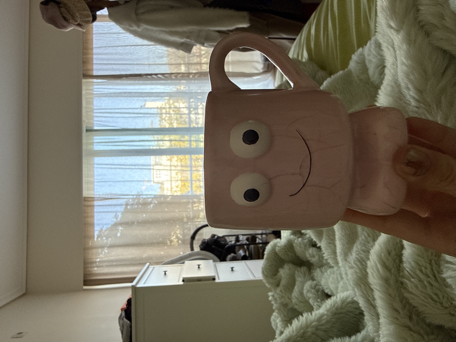 An indoor scene, likely a bedroom, is depicted with a light pink ceramic mug held by a hand in the lower center foreground