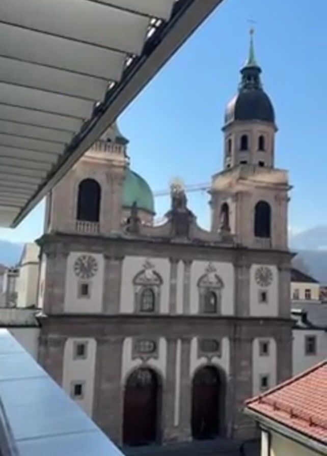 partial view from a balcony overlooking a large, ornate church. The church has a green dome and a tall tower with a black dome and cross on top. Two clock faces can be seen on the front of the church. In the background, snow-capped mountains are visible under a clear blue sky. The balcony has a white retractable awning, and the red-tiled roof of another building is visible in the foreground.