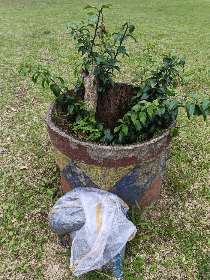 The scene depicts a weathered concrete planter situated on a grassy area in Lokossa, Benin. The planter is cylindrical, with a wide, rough rim, and features faded, peeling paint in geometric patterns of red, yellow, blue, and dark brown. Inside, a small, multi-stemmed plant with a textured, gnarled trunk and numerous vibrant green leaves grows from the dark soil. Smaller green shoots are also visible within the planter. Resting against the base of the planter on the grass is a crumpled, semi-transparent white mesh bag, possibly containing a darker, opaque material or refuse. The surrounding environment consists of a uniformly cut, predominantly green lawn with some areas of drier, lighter grass and bare soil patches. No individuals are present, and no actions are occurring. The lighting indicates an outdoor daytime setting.